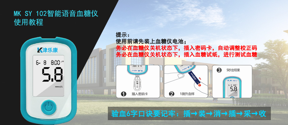 民康MK SY102智能語音血糖儀使用教程,提示: 使用前請先裝上血糖儀電池; 務必在血糖儀關機狀態(tài)下,插入密碼卡,自動調(diào)整校正碼 務必在血糖儀關機狀態(tài)下,插入血糖試紙,進行測試血糖